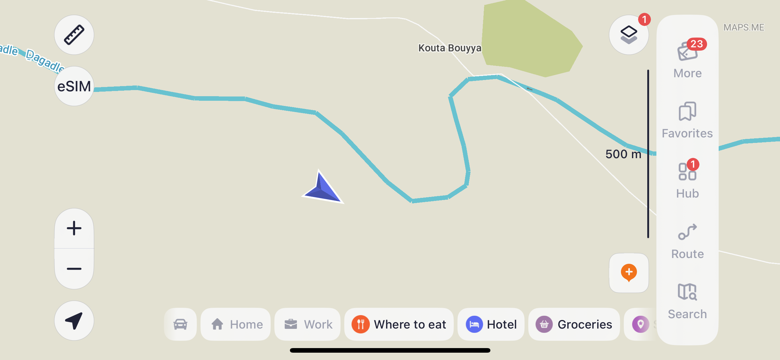 IMPORTANT THING – the inbound way towards the lake it is fairly simple, you just follow Maps.me and visible tracks and it brings you straight there. ON THE WAY back though there is an area in Kouta Bouyya village where there are multiple tracks and it is not as obvious which one to take. We searched a bit around but we eventually managed to find the correct track as we remembered how it looked like the day before. When you get to this area, try to take visual clues as a reminder. The map will look like below.